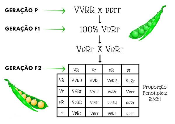 Em seu experimento, Mendel sempre utilizava como geração parental progenitores puros, ou seja, que, após várias gerações de autopolinização, geram descendentes com a mesma característica. Desse cruzamento, Mendel obteve 100% de ervilhas com semente lisa e amarela (geração F1). As plantas dessa geração são dí-hibridas, pois são heterozigotaspara as duas características (RrVv).