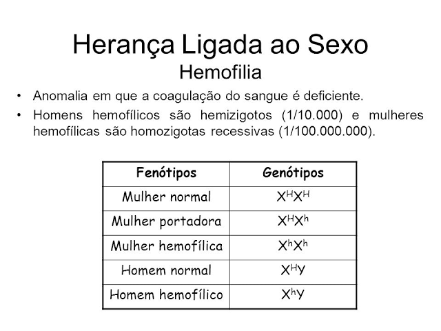 Hemofilia: esse é um outro problema decorrente da herança ligada ao sexo pelo cromossomo X e provoca incapacidade de coagulação sanguínea. Uma pessoa hemofílica pode apresentar sangramentos prolongados mesmo em pequenos ferimentos, além de provocar grandes riscos de hemorragia interna.